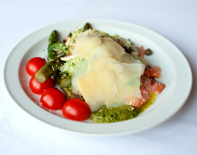 Теплая спаржа с севиче из лосося и зеленым салатом