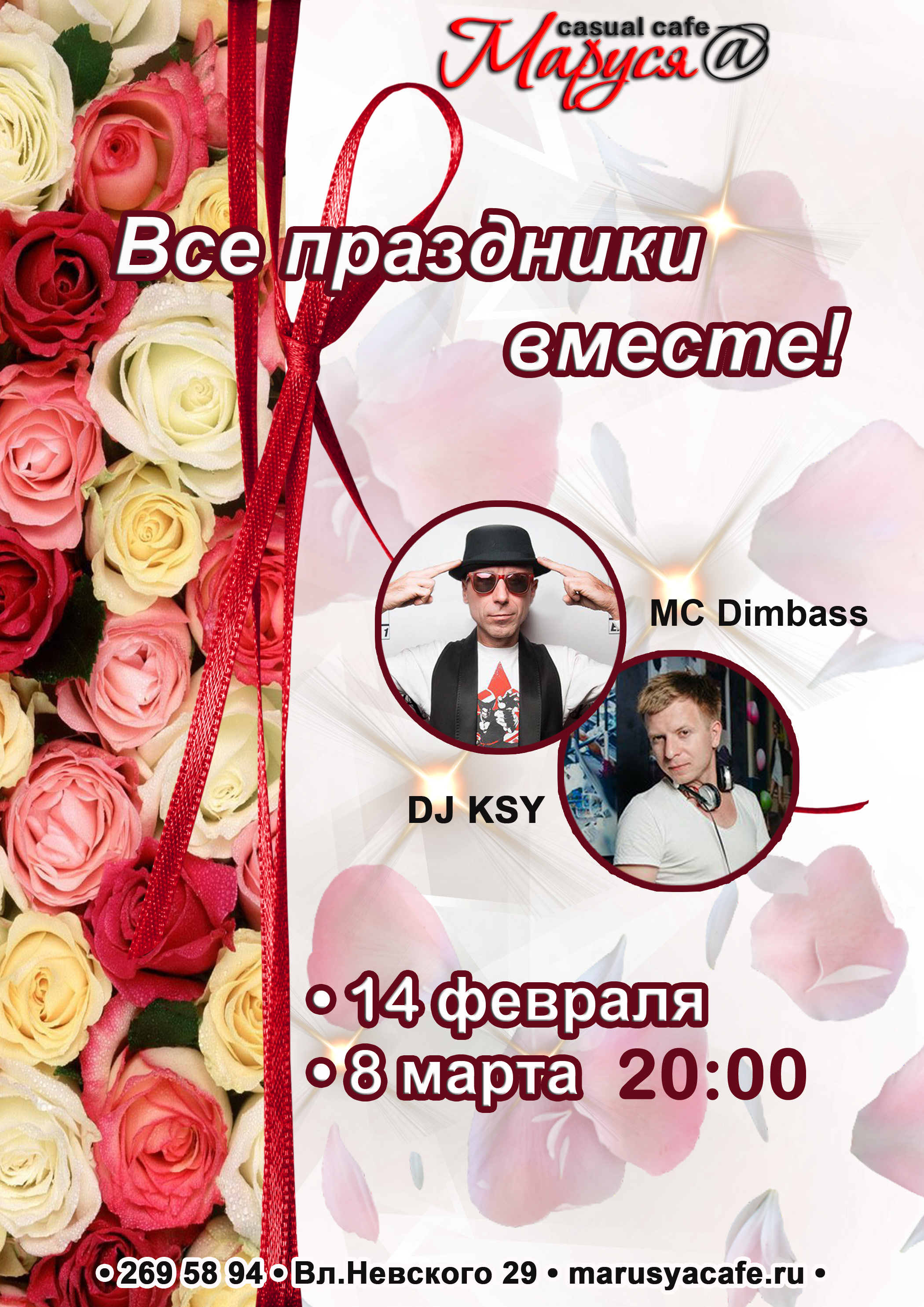 Самые романтичные праздники уже не за горами! Знаете, где будет волшебная романтическая атмосфера, тонна юмора и подарки? У нас в casual cafe Маруся! 14 февраля и 8 марта в 20:00 Итак, что же будет? MC Dimbass танцевальные сеты от DJ K.S.Y розыгрыши комплименты от шефа Следите за нами в соцсетях: VK - casualcafemarusya Instagram - marusya_cafe Звоните и бронируйте столики! т. 269-58-94 Вл.Невского 29 |